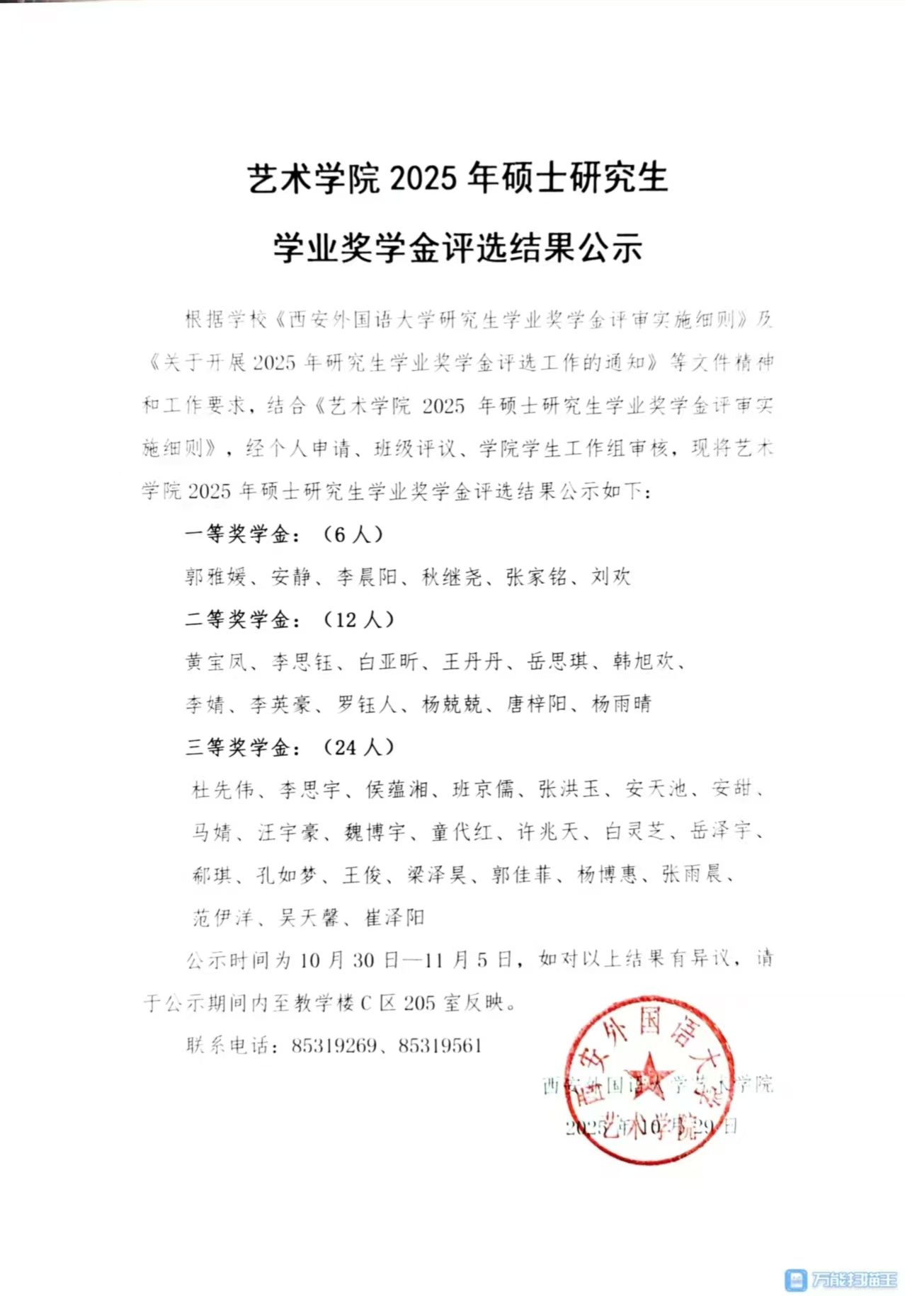 根据学校《西安外国语大学研究生学业奖学金评审实施细则》及《关于开展2025年研究生学业奖学金评选工作的通知》等文件精神和工作要求,结合《福利姬 2025年硕士研究生学业奖学金评审实施细则》,经个人申请、班级评议、学院学生工作组审核,现将福利姬 2025年硕士研究生学业奖学金评选结果公示如下: