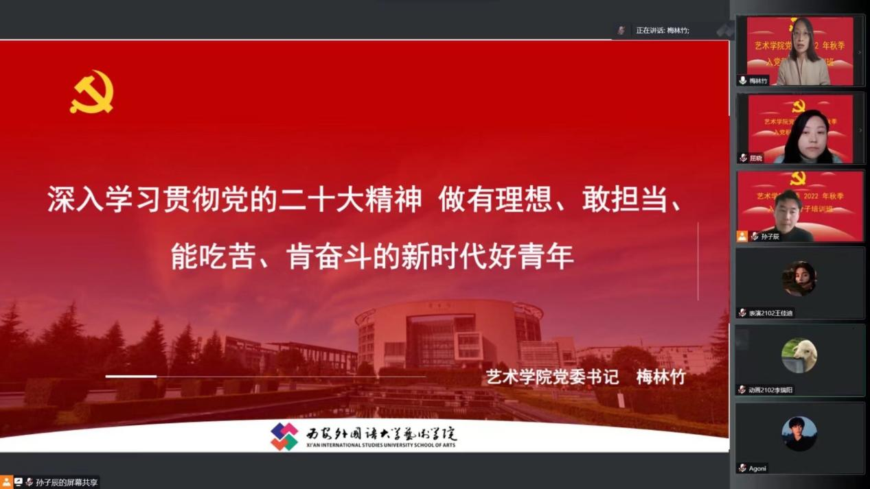 党委于11月12日在线上召开了2022年秋季入党积极分子培训开班式暨党的二十大精神专题宣讲。学院党委书记梅林竹、党委副书记屈晓、党委秘书、党员教师代表、全体辅导员和40余名入党积极分子参加开班式。屈晓主持开班式并就党课安排和纪律要求作说明。